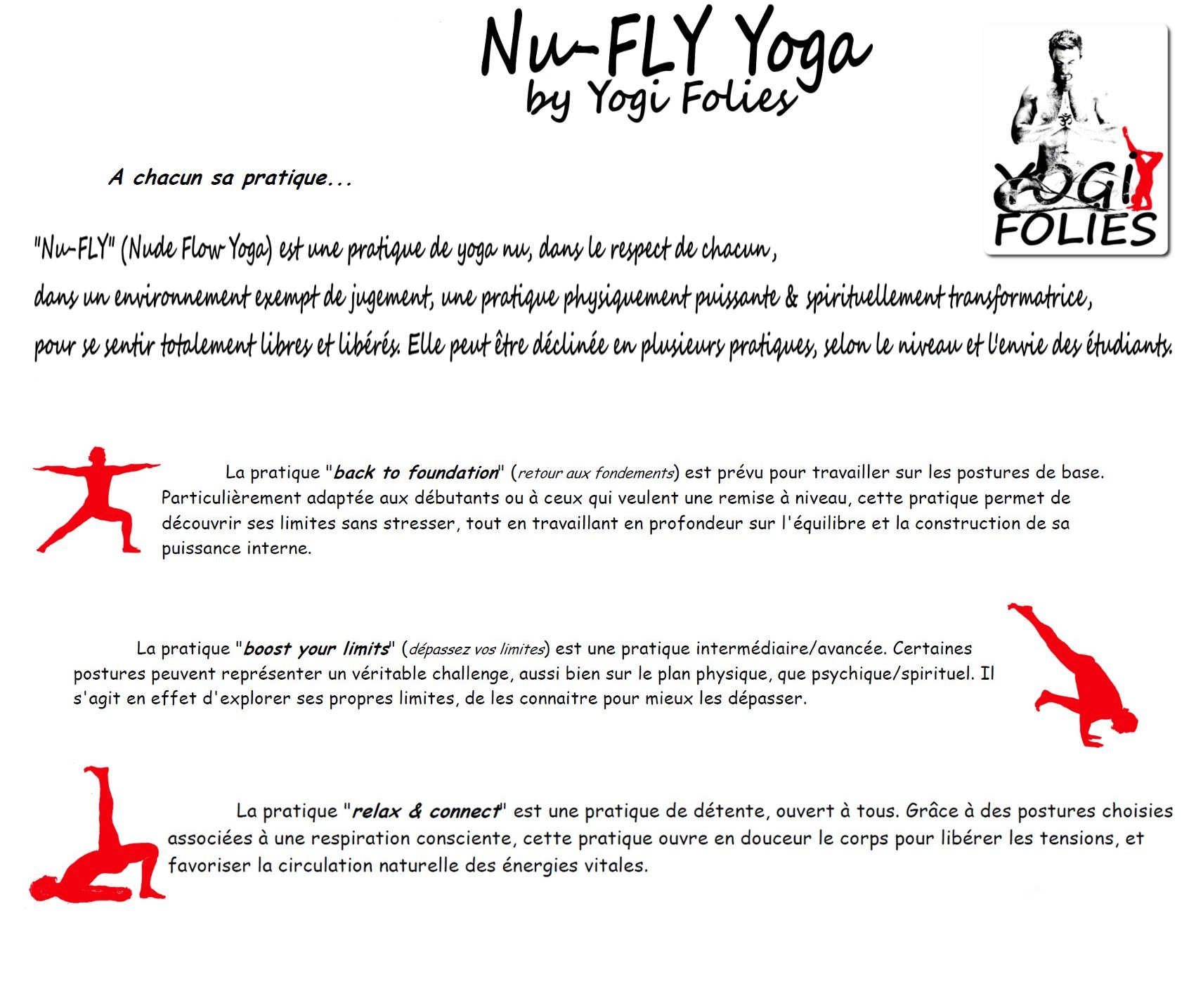 « Nu-FLY » (Nude Flow Yoga) est une pratique de yoga nu, dans le respect de chacun, dans un environnement exempt de jugement, une pratique physiquement puissante & spirituellement transformatrice, pour se sentir totalement libres et libérés. Elle peut être déclinée en plusieurs pratiques, selon le niveau et l’envie des étudiants.